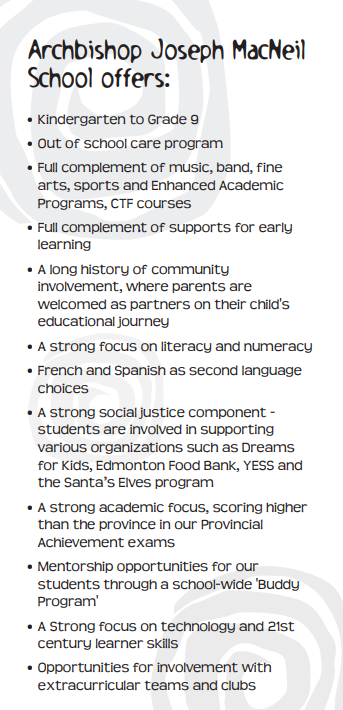 Thank you for considering Archbishop Joseph MacNeil for your child. Our Open Houses were held on January 30th for Kindergarten and February 6th for Junior High. You can also find registration information here. Please call the office at 780-471-4218 with any questions, we'd love to speak with you about our school!